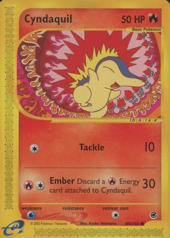 The Cyndaquil 2002 Expedition #105/165 Base card in Raw TCG (Near Mint) condition has moved up $6.05 (+46.7%) in the last 30 days and was last sold for $19.00 .