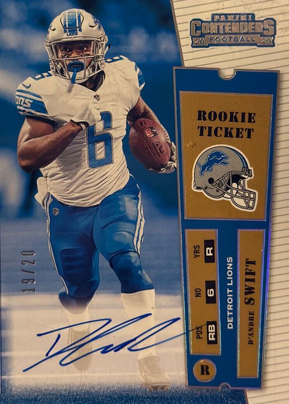 This card is 1 of 20 D'Andre Swift's card variations in the 2020 Contenders set being tracked by Sports Card Investor, including Rookie Ticket Auto, Rookie Ticket Auto Variation, Rookie Ticket Auto - Red Zone Ticket, Rookie Ticket Auto - Ticket Stub (/6), and Rookie Ticket Auto Variation - Red Zone Ticket.