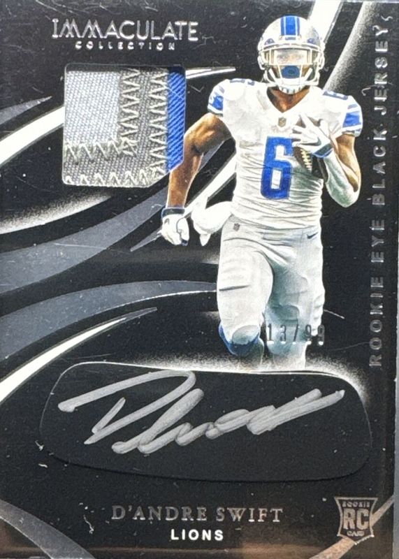 The D'Andre Swift 2020 Immaculate #REB-8 Immaculate Rookie Eye Black Jersey Autographs (/99) card in Raw condition has not changed in price in the last 30 days and was last sold for $20.50 .