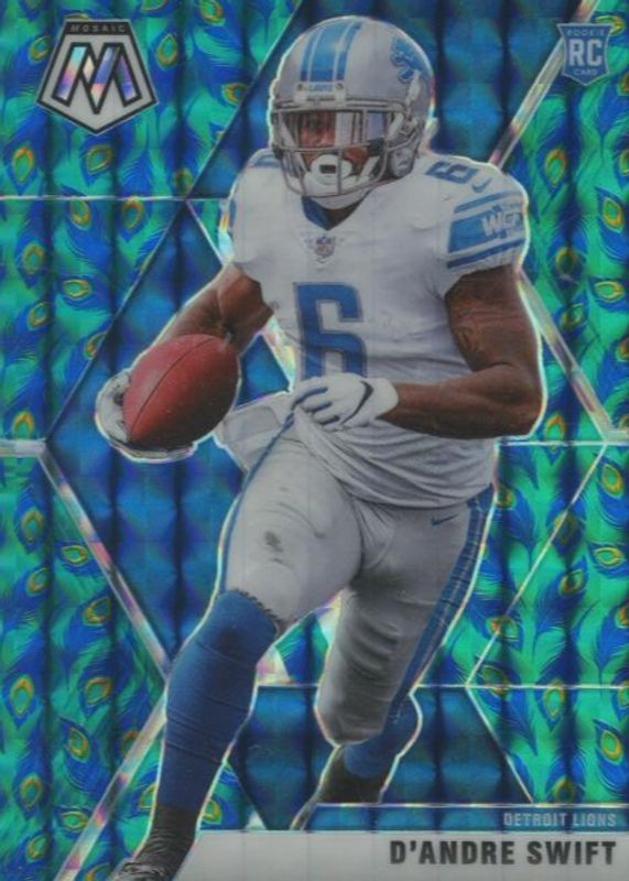 The D'Andre Swift 2020 Mosaic #215 Choice Peacock /(SSP) Rookie card in Raw condition has not changed in price in the last 30 days and was last sold for $113.61 .