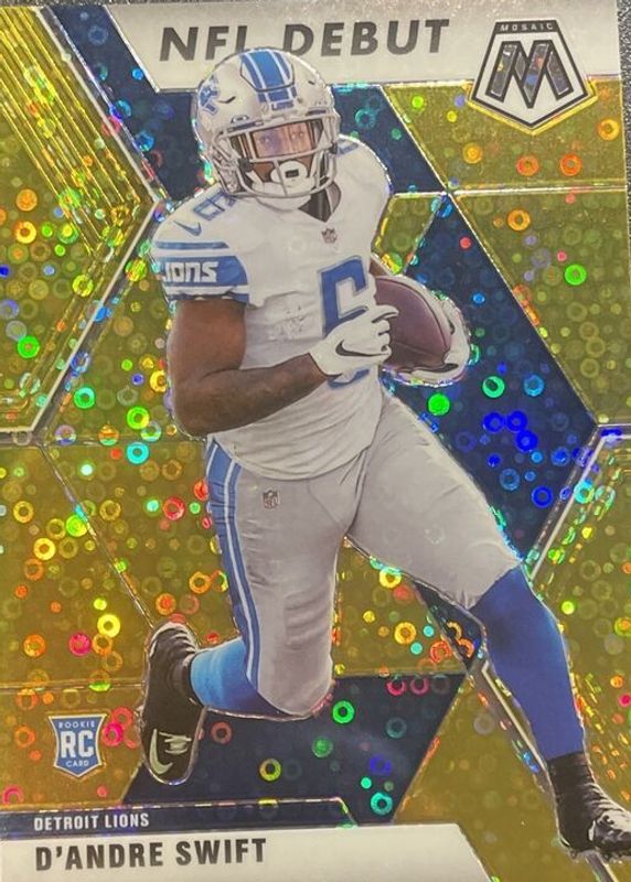 The D'Andre Swift 2020 Mosaic #274 NFL Debut - No Huddle Gold /10 Rookie card in Raw condition has not changed in price in the last 30 days and was last sold for $115.00 .