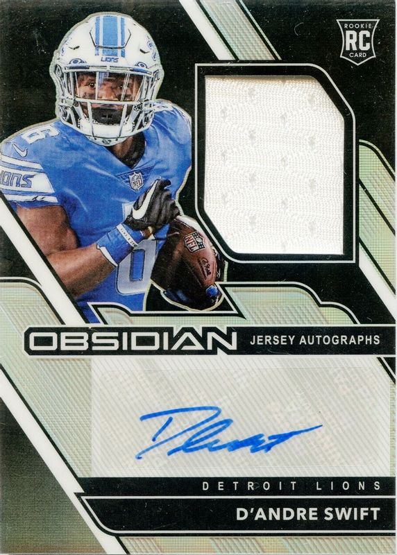 The D'Andre Swift 2020 Obsidian #215 Rookie Jersey Autographs (/150) card in Raw condition has not changed in price in the last 30 days and was last sold for $14.50 .
