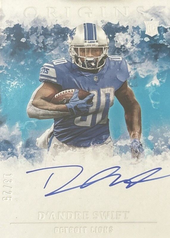 This card is 1 of 9 D'Andre Swift's card variations in the 2020 Origins set being tracked by Sports Card Investor, including Rookie Autographs, Rookie Autographs - Red /99, Rookie Autographs - Blue /49, Rookie Autographs - Purple FOTL /17, and Rookie Autographs - Gold /10.