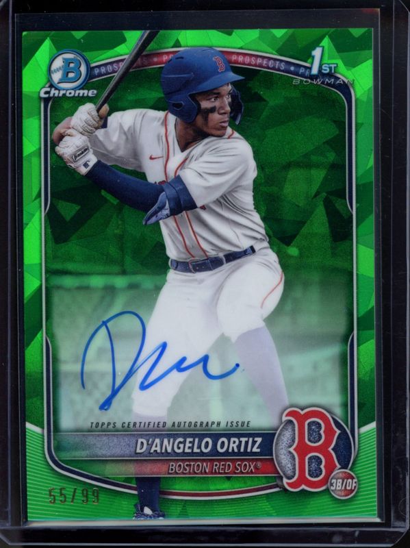 The D'Angelo Ortiz 2025 Bowman Sapphire Edition #CPS-DO Chrome Prospect Autographs - Green Refractor /99 card is 1 of 16 D'Angelo Ortiz's card variations in the 2025 Bowman Sapphire Edition set being tracked by Sports Card Investor, including Chrome Prospects, Chrome Prospect Autographs /199, Chrome Prospects - Green Refractor /99, Chrome Prospects - Yellow Refractor /75, and Chrome Prospect Autographs - Gold Refractor /50.
