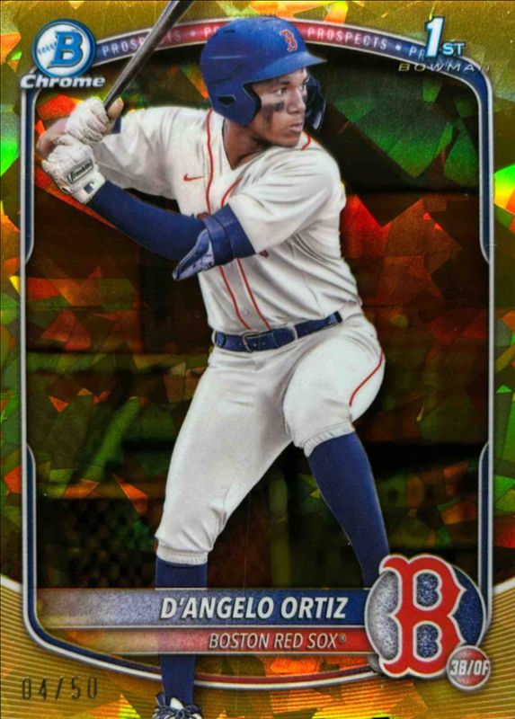 The D'Angelo Ortiz 2025 Bowman Sapphire Edition #BCP-61 Chrome Prospects - Gold Refractor /50 card is 1 of 16 D'Angelo Ortiz's card variations in the 2025 Bowman Sapphire Edition set being tracked by Sports Card Investor, including Chrome Prospects, Chrome Prospect Autographs /199, Chrome Prospect Autographs - Green Refractor /99, Chrome Prospects - Green Refractor /99, and Chrome Prospects - Yellow Refractor /75.
