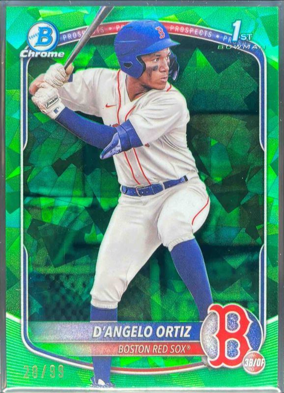 The D'Angelo Ortiz 2025 Bowman Sapphire Edition #BCP-61 Chrome Prospects - Green Refractor /99 card is 1 of 16 D'Angelo Ortiz's card variations in the 2025 Bowman Sapphire Edition set being tracked by Sports Card Investor, including Chrome Prospects, Chrome Prospect Autographs /199, Chrome Prospect Autographs - Green Refractor /99, Chrome Prospects - Yellow Refractor /75, and Chrome Prospect Autographs - Gold Refractor /50.