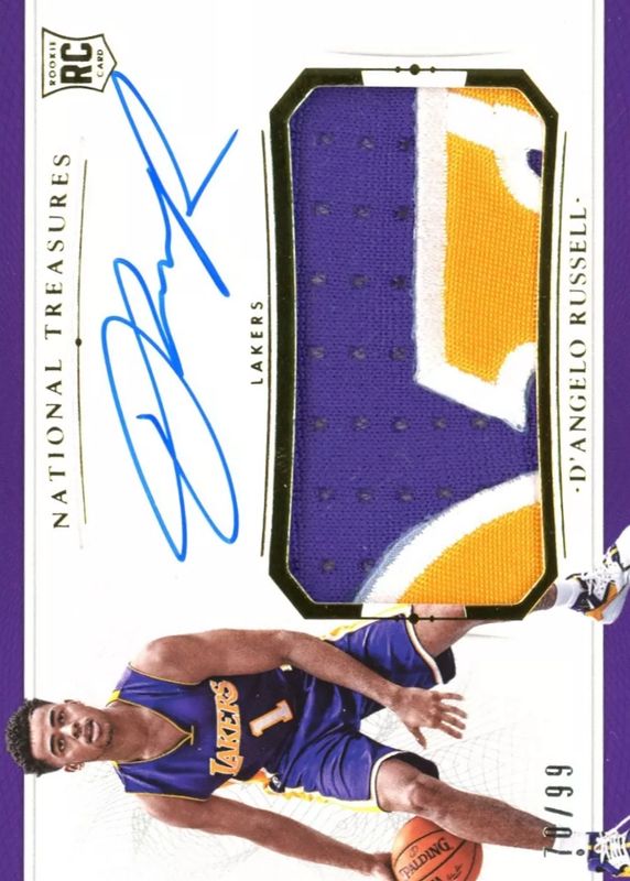 This card is 1 of 6 D'Angelo Russell's card variations in the 2015 National Treasures set being tracked by Sports Card Investor, including Rookie Patch Auto - Silver /25, Rookie Patch Auto - Gold /10, Rookie Patch Auto - Emerald /5, Rookie Patch Auto - Logoman /1, and Rookie Patch Auto - Platinum /1.