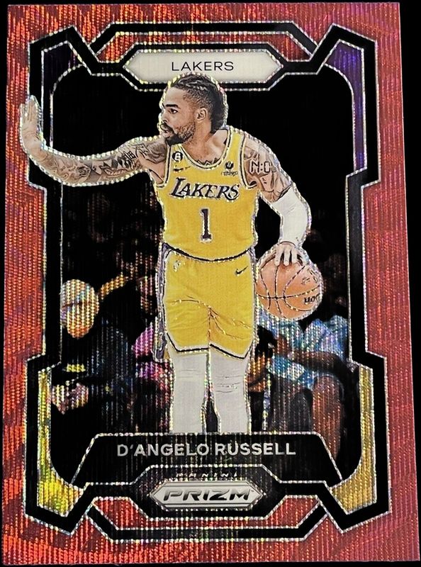 The D'Angelo Russell 2023 Prizm #111 Ruby Wave card is 1 of 65 D'Angelo Russell's card variations in the 2023 Prizm set being tracked by Sports Card Investor, including Base, Blue Wave, Choice Blue Yellow Green, Fast Break, and Green.