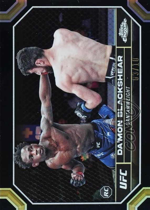 The Da’Mon Blackshear 2024 Topps Chrome UFC #21 Black Refractor /10 Rookie card in Raw condition has not changed in price in the last 30 days and was last sold for $12.50 .