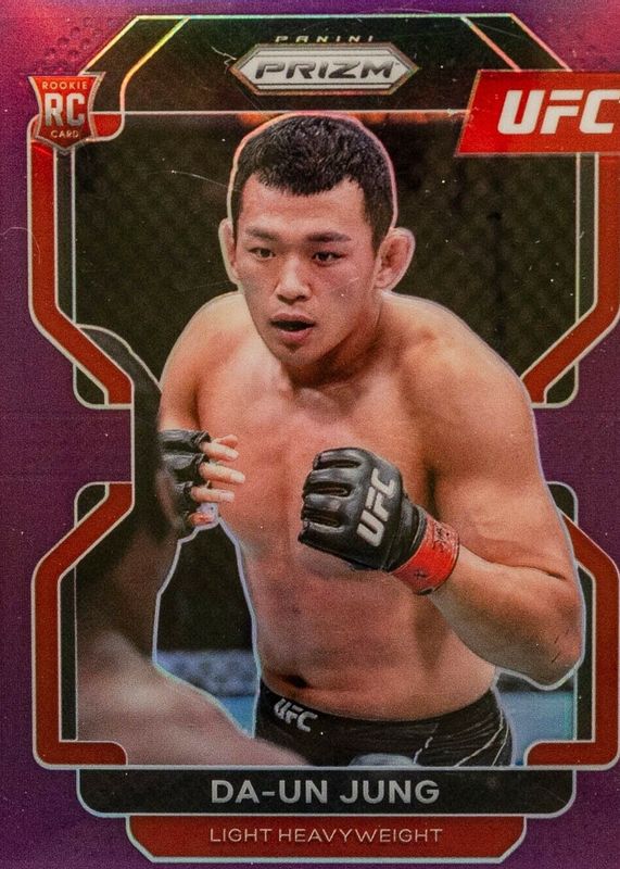 The Da Un Jung 2022 Prizm UFC #151 Purple /149 Rookie card in Raw condition has not changed in price in the last 30 days and was last sold for $2.25 .