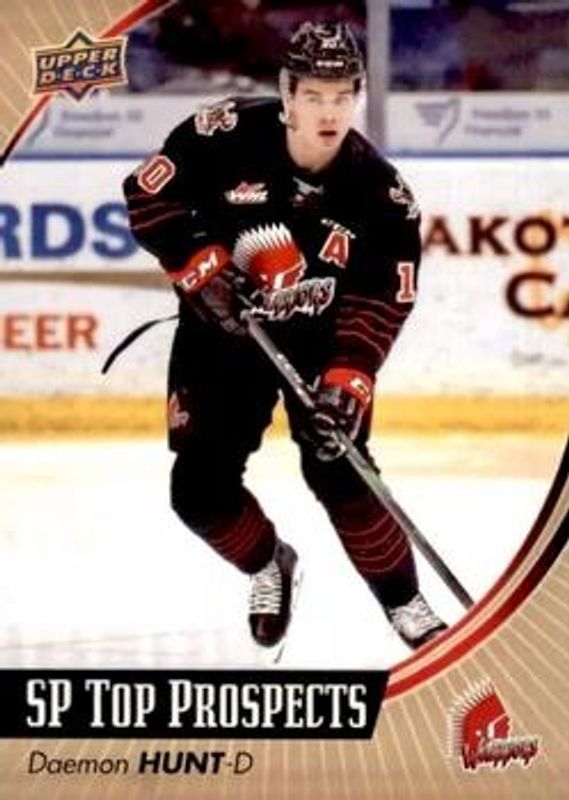 The Daemon Hunt 2019 Upper Deck CHL #SP-12 SP Top Prospects card is 1 of 10 Daemon Hunt's card variations in the 2019 Upper Deck CHL set being tracked by Sports Card Investor, including Base, Printing Plates Black /1, Printing Plates Cyan /1, Printing Plates Magenta /1, and Printing Plates Yellow /1.