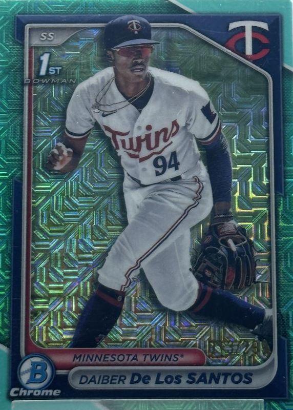 This card is 1 of 11 Daiber De Los Santos' card variations in the 2024 Bowman Chrome Mega Box set being tracked by Sports Card Investor, including Prospects (1st), Prospects - Purple Mojo Refractor /250 (1st), Prospects - Pink Mojo Refractor /199 (1st), Prospects - Blue Mojo Refractor /150 (1st), and Prospects - Green Mojo Refractor /99 (1st).