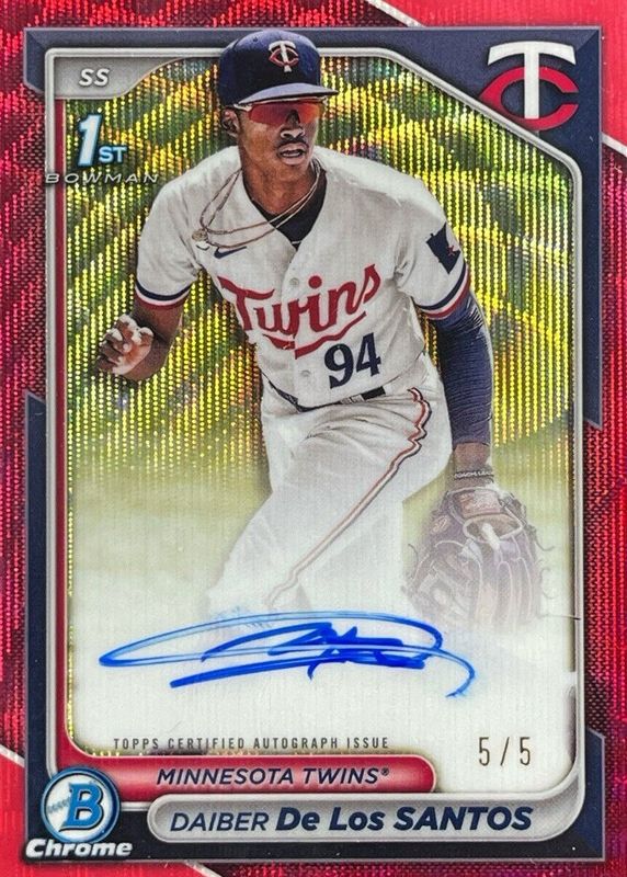 The Daiber De Los Santos 2024 Bowman Chrome #CPA-DD Prospect Auto - Red Wave Refractor /5 (1st) card in Raw condition has not changed in price in the last 30 days and was last sold for $560.00 .