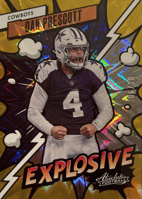 The Dak Prescott 2023 Absolute #1 Explosive - Gold /10 card in Raw condition has not changed in price in the last 30 days and was last sold for $400.00 .