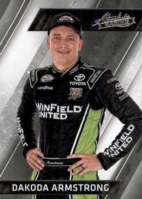 The Dakoda Armstrong 2017 Absolute NASCAR #38 Base card is 1 of 13 Dakoda Armstrong's card variations in the 2017 Absolute NASCAR set being tracked by Sports Card Investor, including Spectrum Silver /299, Spectrum Blue /199, Spectrum Red /99, Spectrum Gold /25, and Printing Plates Black /1.