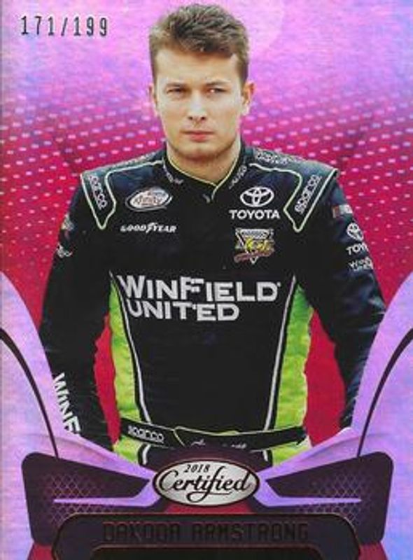 The Dakoda Armstrong 2018 Certified NASCAR #53 Red /25 card is 1 of 30 Dakoda Armstrong's card variations in the 2018 Certified NASCAR set being tracked by Sports Card Investor, including Base /149, Orange /249, Mirror Gold /25, Blue /20, and Gold /15.