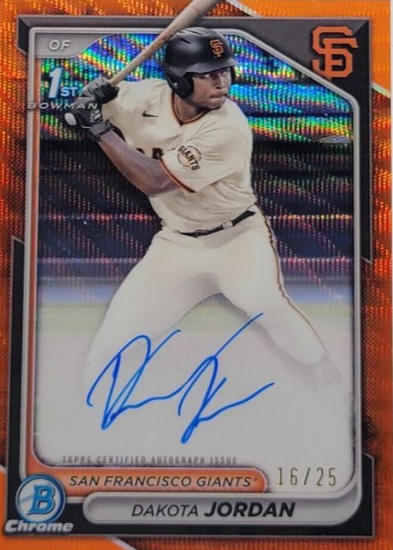 Auctions Ending Soon for Dakota Jordan 2024 Bowman Draft #CPA-DJ Chrome DP Auto - Orange Wave Refractor /25 (1st) RAW