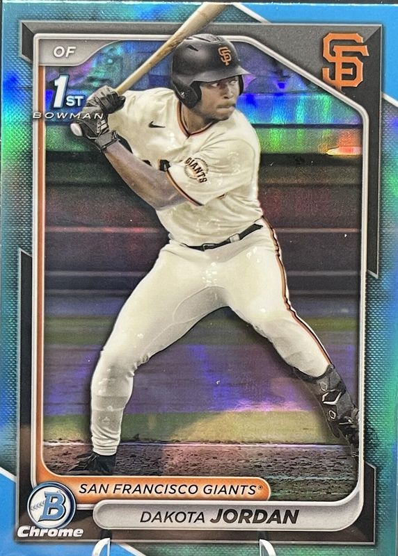 The Dakota Jordan 2024 Bowman Draft #BDC-71 Chrome - Sky Blue Refractor (1st) card in Raw condition has moved up $1.46 (+53.1%) in the last 30 days and was last sold for $4.21 .
