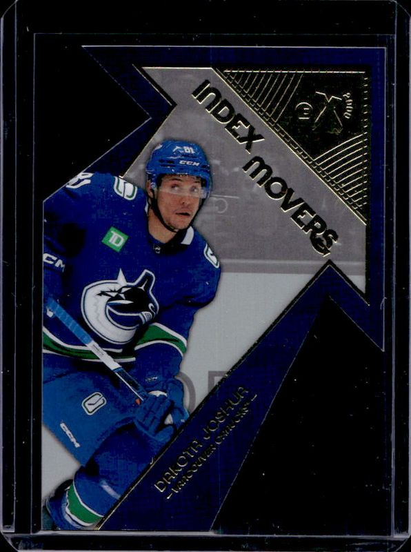The Dakota Joshua 2023 Skybox E-X 2000 #IM-13 Index Movers card is 1 of 9 Dakota Joshua's card variations in the 2023 Skybox E-X 2000 set being tracked by Sports Card Investor, including Index Movers Speckle Autographs, Index Movers - Speckle /99, Index Movers - Gold Speckle /25, Index Movers - Printing Plates Black /1, and Index Movers - Printing Plates Cyan /1.