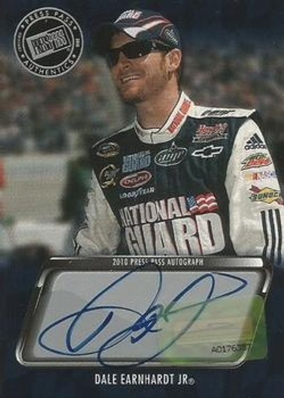 The Dale Earnhardt Jr. 2010 Press Pass Eclipse Autographs card is 1 of 69 Dale Earnhardt Jr.'s card variations in the 2010 Press Pass Eclipse set being tracked by Sports Card Investor, including #77 Base, #5 Base, #71 Base, #5 Gallery Edition, and #71 Gallery Edition.