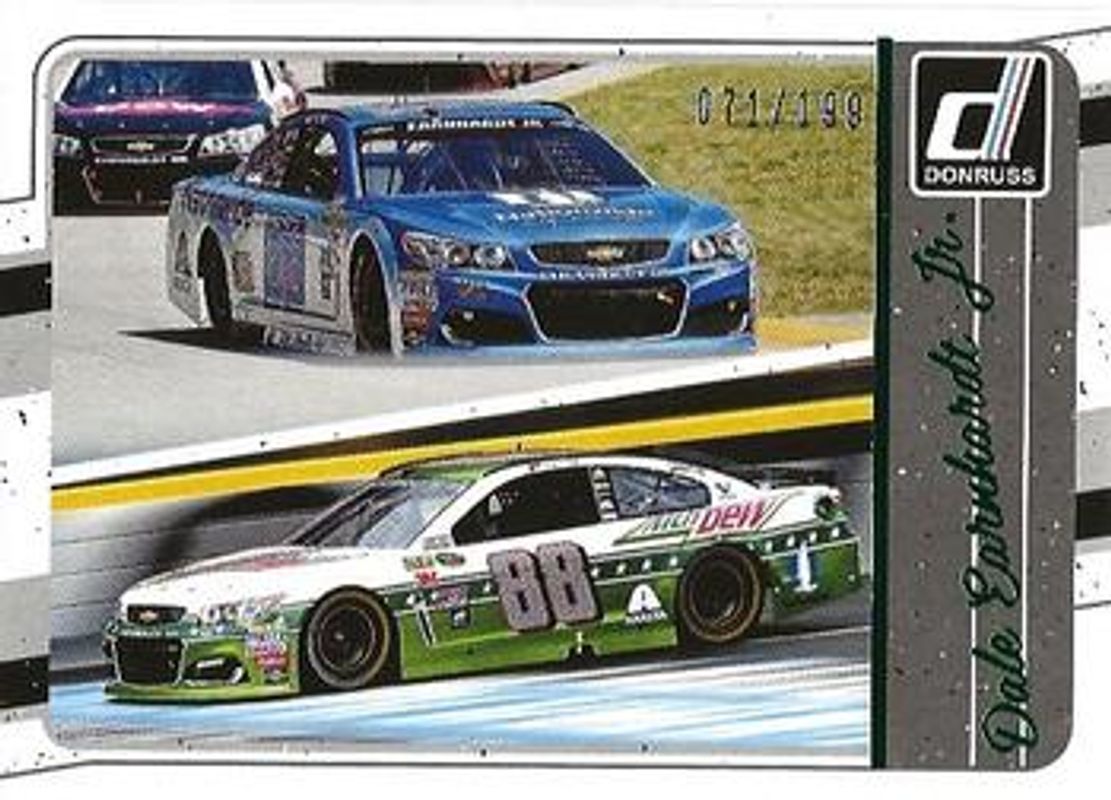 The Dale Earnhardt Sr. 2017 Donruss NASCAR #100 Green Foil /199 card is 1 of 98 Dale Earnhardt Sr.'s card variations in the 2017 Donruss NASCAR set being tracked by Sports Card Investor, including #100 Base, #137 Base, #3 Base, #37a Base, and #37b Base.