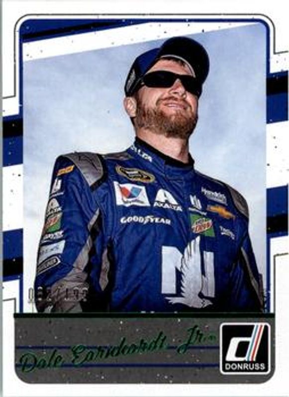 The Dale Earnhardt Sr. 2017 Donruss NASCAR #37a Green Foil /199 card is 1 of 98 Dale Earnhardt Sr.'s card variations in the 2017 Donruss NASCAR set being tracked by Sports Card Investor, including #100 Base, #137 Base, #3 Base, #37a Base, and #37b Base.