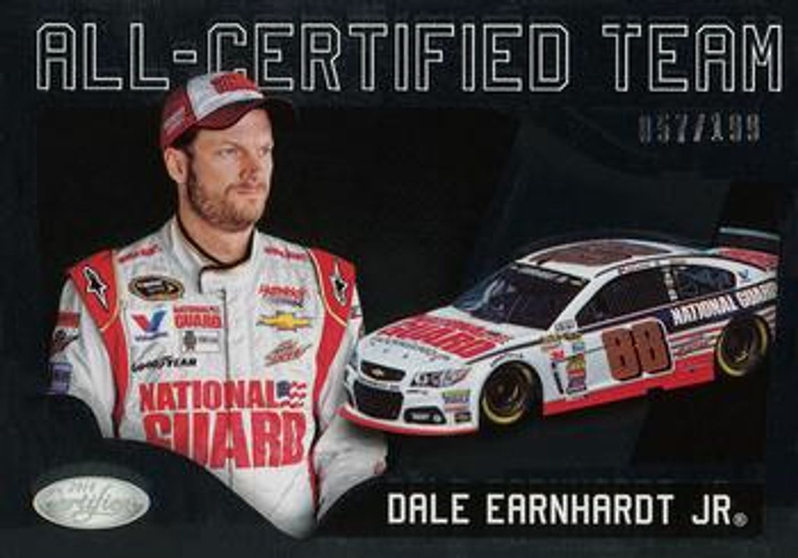 The Dale Earnhardt Sr. 2018 Certified NASCAR #ACT2 All Certified Team /199 card is 1 of 97 Dale Earnhardt Sr.'s card variations in the 2018 Certified NASCAR set being tracked by Sports Card Investor, including #11 Base /149, #86 Base /149, #86 Orange /249, #11 Orange /249, and #86 Mirror Gold /25.