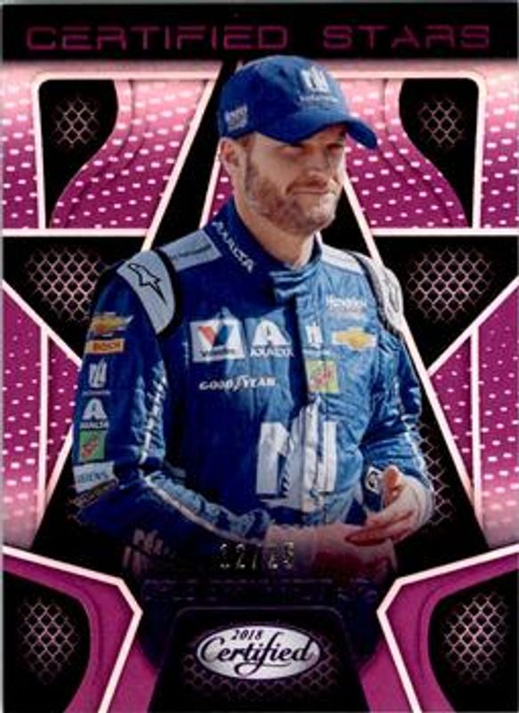 The Dale Earnhardt Sr. 2018 Certified NASCAR #CS22 Certified Stars - Purple /25 card is 1 of 97 Dale Earnhardt Sr.'s card variations in the 2018 Certified NASCAR set being tracked by Sports Card Investor, including #11 Base /149, #86 Base /149, #86 Orange /249, #11 Orange /249, and #86 Mirror Gold /25.