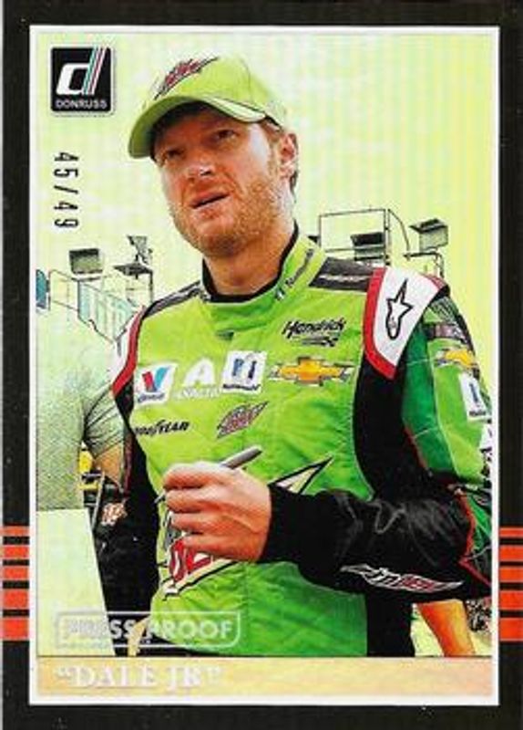 The Dale Earnhardt Sr. 2018 Donruss NASCAR #101b Press Proof Holofoil /49 card is 1 of 101 Dale Earnhardt Sr.'s card variations in the 2018 Donruss NASCAR set being tracked by Sports Card Investor, including #53b Base, #53a Base, #2 Base, #101b Base, and #150 Base.