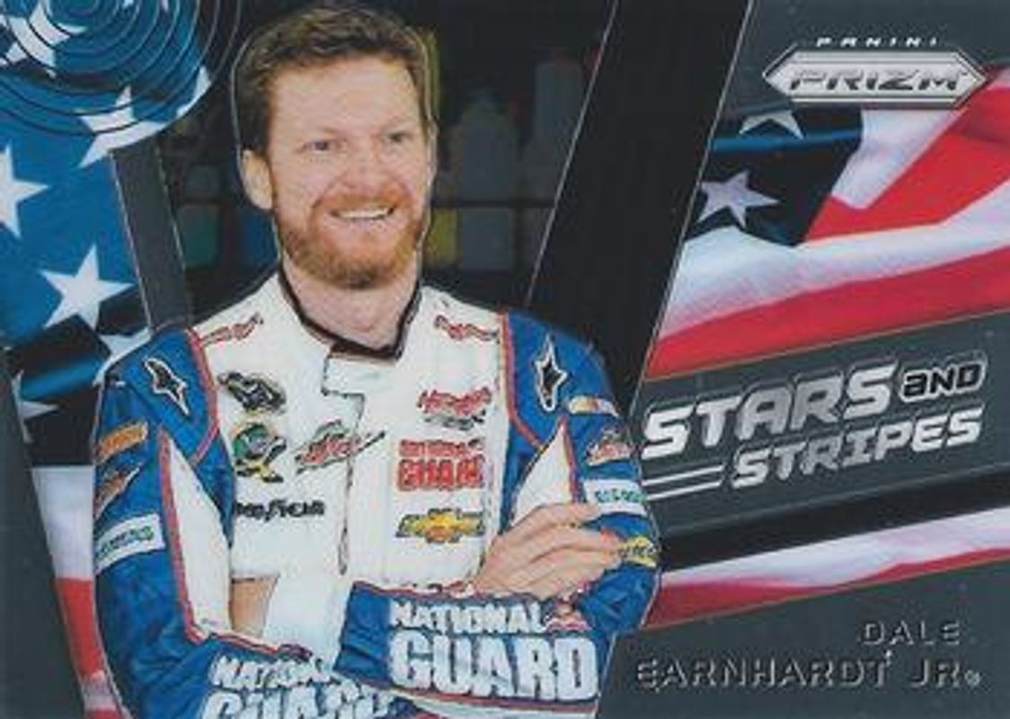The Dale Earnhardt Sr. 2018 Prizm NASCAR #SS-10 Stars & Stripes card is 1 of 108 Dale Earnhardt Sr.'s card variations in the 2018 Prizm NASCAR set being tracked by Sports Card Investor, including #83 Base, #72 Base, #69 Base, #56 Base, and #22b Base.