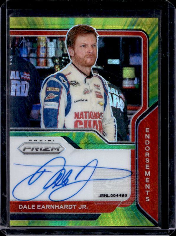The Dale Earnhardt Sr. 2021 Prizm NASCAR #E-JR Endorsements - Hyper Green & Yellow /10 card is 1 of 62 Dale Earnhardt Sr.'s card variations in the 2021 Prizm NASCAR set being tracked by Sports Card Investor, including Base, Blue, Hyper Blue & Carolina Blue, Hyper Green & Yellow, and Hyper Red & Blue.