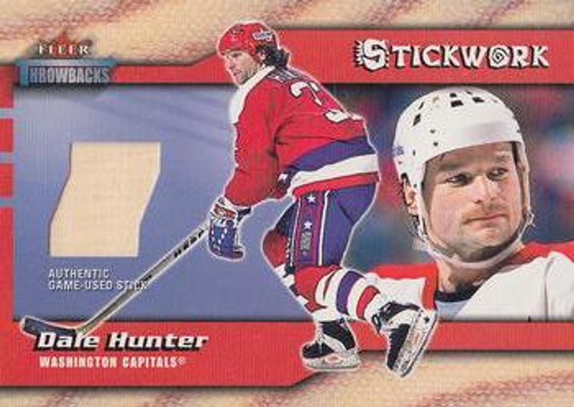 The Dale Hunter 2002 Fleer Throwbacks #2 Stickwork card is 1 of 4 Dale Hunter's card variations in the 2002 Fleer Throwbacks set being tracked by Sports Card Investor, including Autographs, Scraps, and Tie Downs /50.