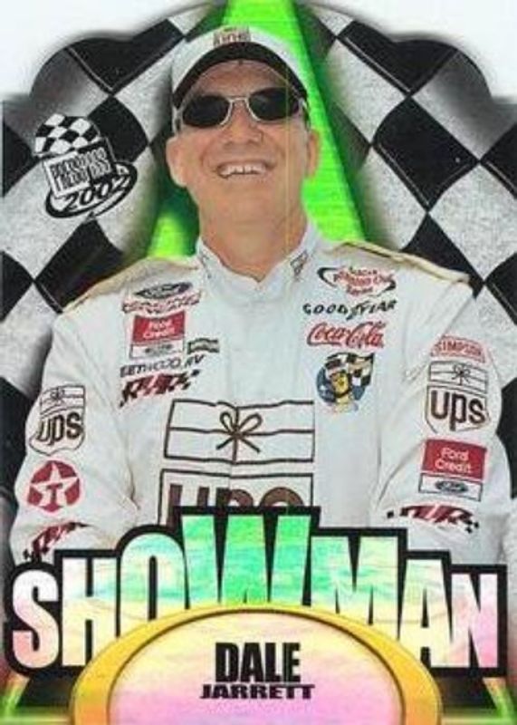 The Dale Jarrett 2002 Press Pass #S-5A Showman card is 1 of 14 Dale Jarrett's card variations in the 2002 Press Pass set being tracked by Sports Card Investor, including Base, Platinum, Autographs, Cup Chase, and Top Shelf.