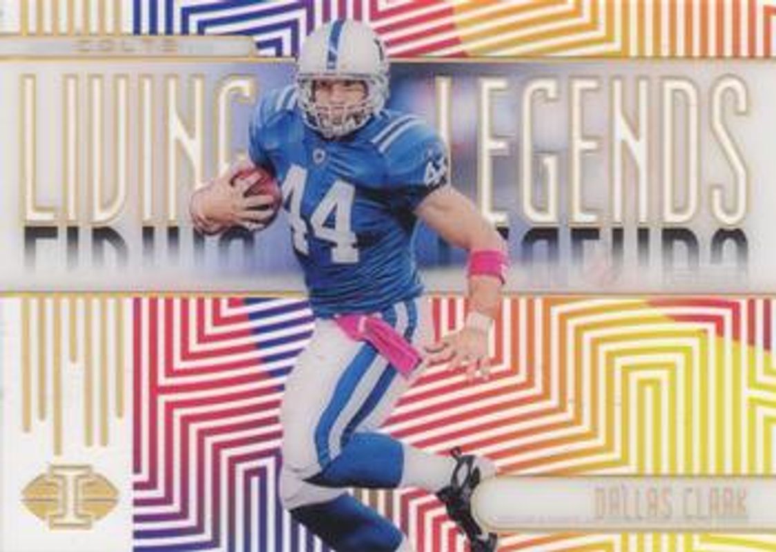 The Dallas Clark 2019 Illusions #LL-DC Living Legends - Gold /399 card is 1 of 10 Dallas Clark's card variations in the 2019 Illusions set being tracked by Sports Card Investor, including Living Legends, Living Legends - Blue /299, Living Legends - Green /149, Living Legends - Red /50, and Living Legends Autographs /25.
