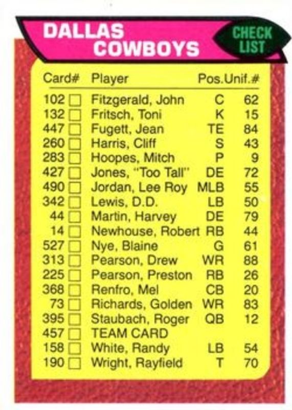 The Dallas Cowboys 1976 Topps #457 Base card is 1 of 2 Dallas Cowboys' card variations in the 1976 Topps set being tracked by Sports Card Investor, including Team Checklist.