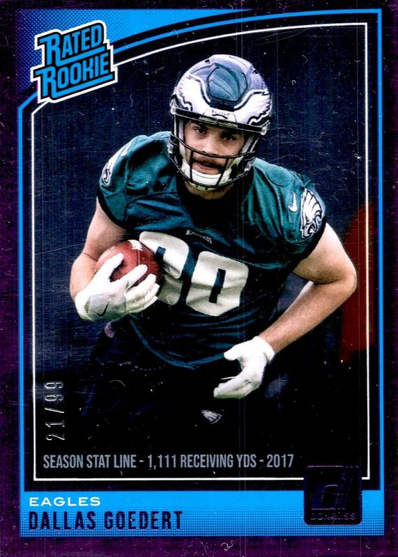 The Dallas Goedert 2018 Donruss #347 Season Stat Line (/99) Rookie card in Raw condition has not changed in price in the last 30 days and was last sold for $6.00 .