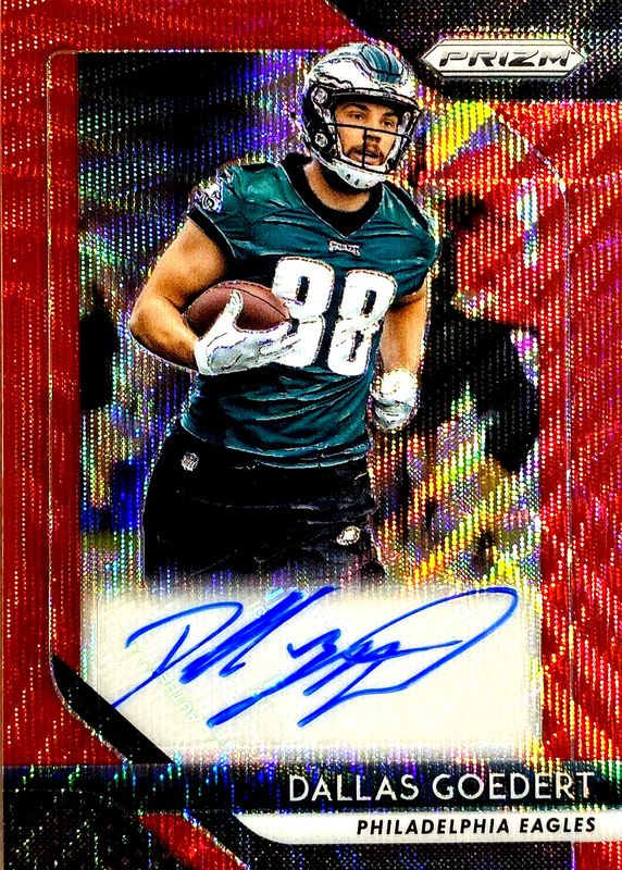 The Dallas Goedert 2018 Prizm #RA-DG Rookie Autographs - Red Wave (/199) card in Raw condition has not changed in price in the last 30 days and was last sold for $42.74 .