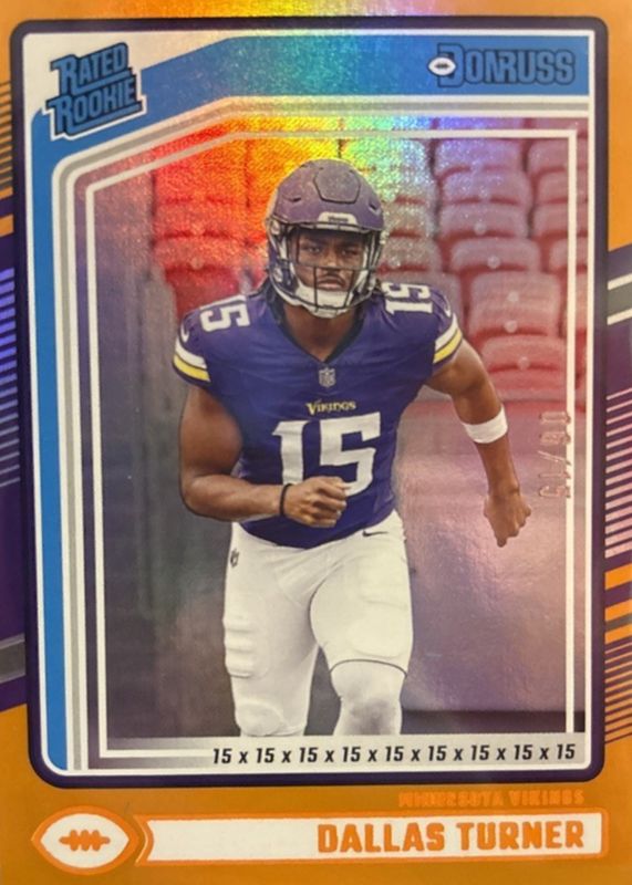 The Dallas Turner 2024 Donruss #331 Jersey Number (/15) Rookie card in Raw condition has not changed in price in the last 30 days and was last sold for $16.50 .