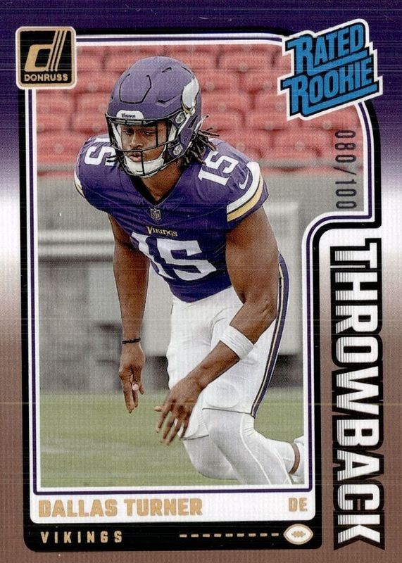 The Dallas Turner 2024 Donruss #1 Rated Rookies Throwback - Studio Series /100 card in Raw condition has not changed in price in the last 30 days and was last sold for $1.49 .