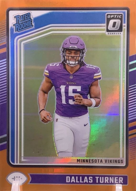 The Dallas Turner 2024 Optic #224 Orange /249 Rookie card in Raw condition has moved down -$2.10 (-41.2%) in the last 30 days and was last sold for $3.00 .
