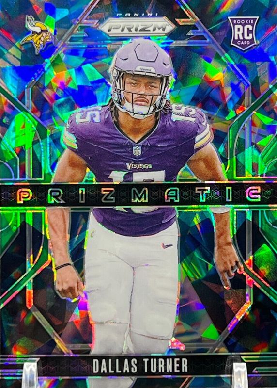 The Dallas Turner 2024 Prizm #17 Prizmatic - Green Ice Rookie card in Raw condition has not changed in price in the last 30 days and was last sold for $1.00 .