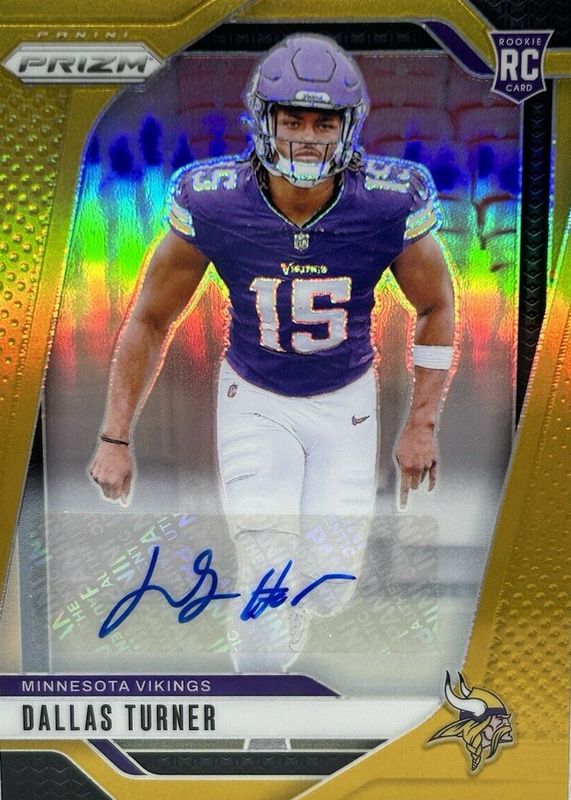 The Dallas Turner 2024 Prizm #324 Rookie Autographs - Gold /10 card in Raw condition has not changed in price in the last 30 days and was last sold for $338.33 .