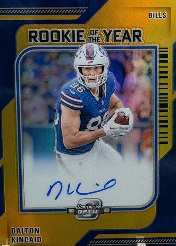 The Dalton Kincaid 2023 Contenders Optic #ROY-DK Rookie of the Year Contenders Autographs - Gold /10 card in Raw condition has not changed in price in the last 30 days and was last sold for $104.50 .