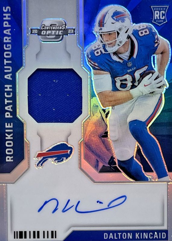 The Dalton Kincaid 2023 Contenders Optic #RPA-DK Rookie Patch Auto /75 card in Raw condition has moved down -$36.00 (-48.0%) in the last 30 days and was last sold for $39.00 .