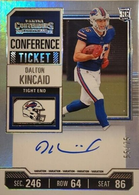 The Dalton Kincaid 2023 Contenders #107 Rookie Ticket Auto Variation - Conference Ticket /75 card in Raw condition has not changed in price in the last 30 days and was last sold for $50.00 .