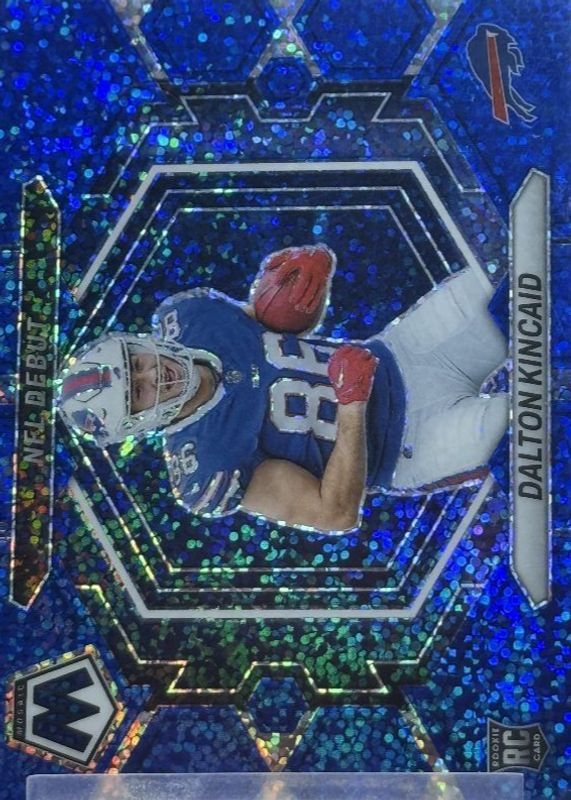 The Dalton Kincaid 2023 Mosaic #ND-20 NFL Debut - Blue Sparkle /96 Rookie card in Raw condition has not changed in price in the last 30 days and was last sold for $5.50 .
