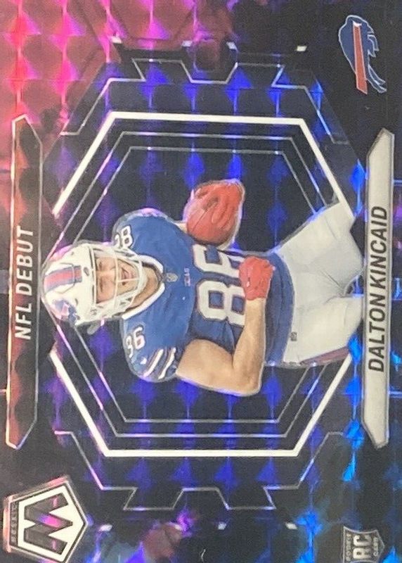 The Dalton Kincaid 2023 Mosaic #ND-20 NFL Debut - Choice Nebula /1 Rookie card in Raw condition has not changed in price in the last 30 days and was last sold for $599.99 .