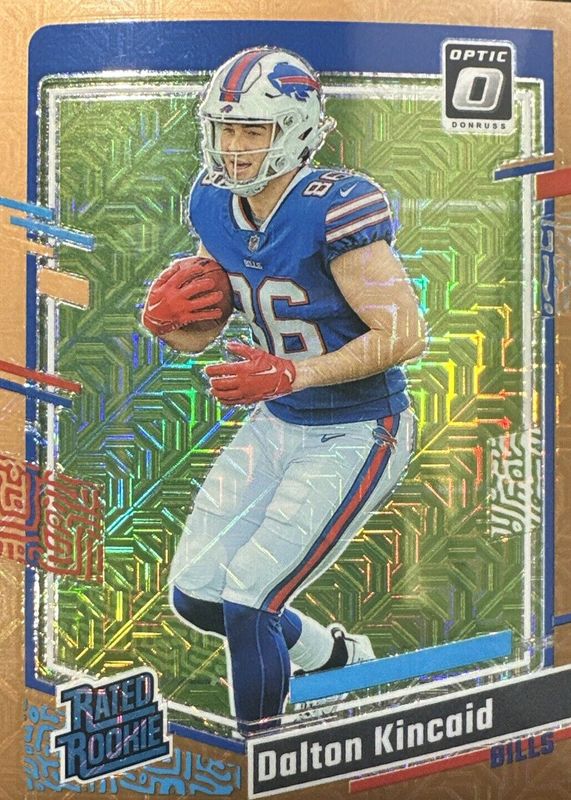 The Dalton Kincaid 2023 Optic #211 Bronze Mojo /35 Rookie card in Raw condition has not changed in price in the last 30 days and was last sold for $28.76 .