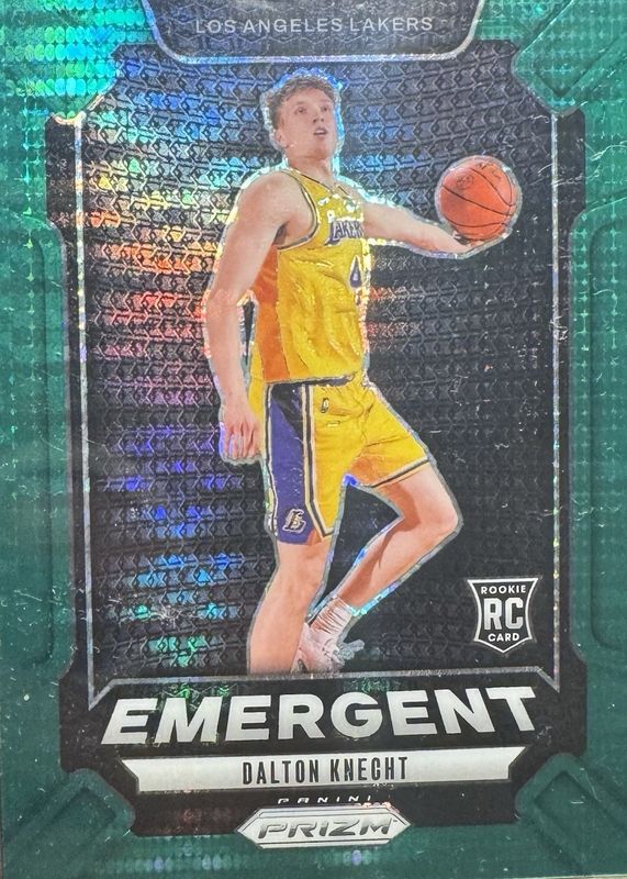 The Dalton Knecht 2024 Prizm #10 Emergent - Green Pulsar /25 Rookie card in Raw condition has not changed in price in the last 30 days and was last sold for $20.50 .