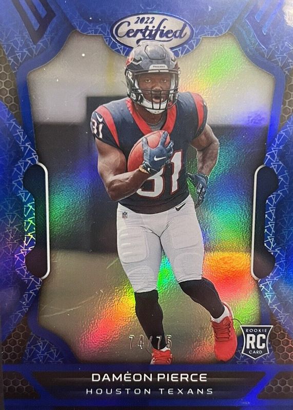 The Dameon Pierce 2022 Certified #125 Mirror Blue /75 Rookie card in Raw condition has not changed in price in the last 30 days and was last sold for $5.50 .